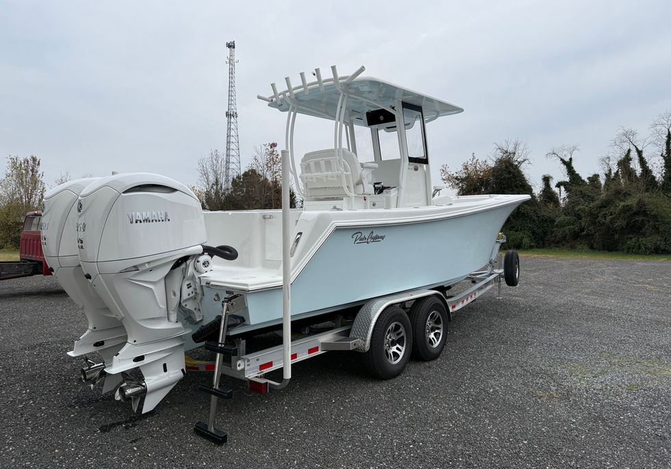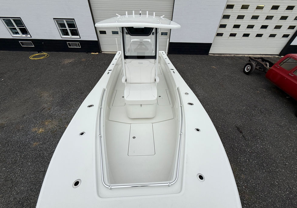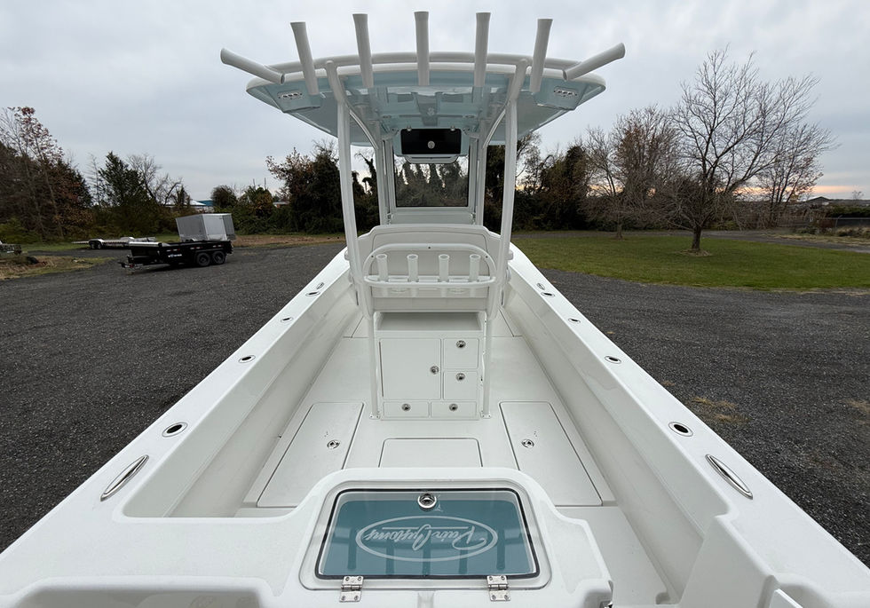 Large fiberglass T-top 6'x9' powder coated with 3-piece acrylic enclosure, 7 rod holders (2 kingfish rod holders), integral outrigger backing plates, 2 speaker pods, 2 LED down lights, LED spreader lights, electronics box and rear legs